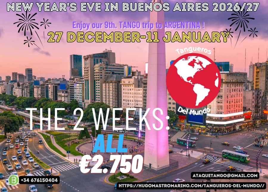 Nochevieja en Buenos Aires con Ataque Tango Un Viaje Tanguero para Despedir el Año al Ritmo del 2x4 ¿Te imaginas bailando tango en el corazón de Buenos Aires, bajo las luces del Obelisco, mientras brindas por el nuevo año? Del 27 de diciembre al 11 de enero, te invitamos a un viaje tanguero inolvidable con Ataque Tango, ideal para los que aman el tango, la cultura argentina y las experiencias auténticas. Incluye: Alojamiento céntrico (a metros del Obelisco) Traslados desde/hacia el aeropuerto Desayuno argentino diario + 1 comida al día Cena Show de Fin de Año Clases de tango y entradas a las mejores milongas Tours históricos y culturales por Buenos Aires Cenas Show de Tango Excursión al Tigre con lancha incluida Fiesta Gaucha con cabalgata y asado tradicional Todos los traslados internos Valor total: 2.290 € ¡Baila, explora, celebra y vive Buenos Aires como nunca antes! ¡Plazas limitadas! Reserva tu lugar escribiéndonos ahora. whatsapp +34 676150404----ataquetango@gmail.com ....https://hugomastromarino.com/tangueros-del-mundo/
